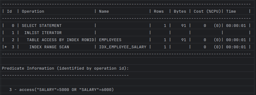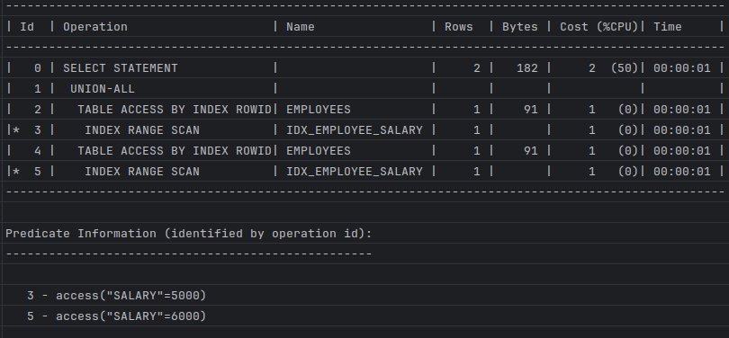 // 인덱스 생성 CREATE INDEX idx_employee_salary ON employees(salary); // In절을 통해서 실행한 경우 (사실 옵티마이저가 IN-List 형태로 in의 갯수만큼 반복하여 Range Scan 적용) EXPLAIN PLAN FOR select * from employees where salary in (5000, 6000); // In절의 조건을 명확하게 Union all을 사용해서 equal로 변경한경우 EXPLAIN PLAN FOR select * from employees where salary = 5000 union all select * from employees where salary = 6000; // 실행계획 확인 SELECT * FROM TABLE(DBMS_XPLAN.DISPLAY);