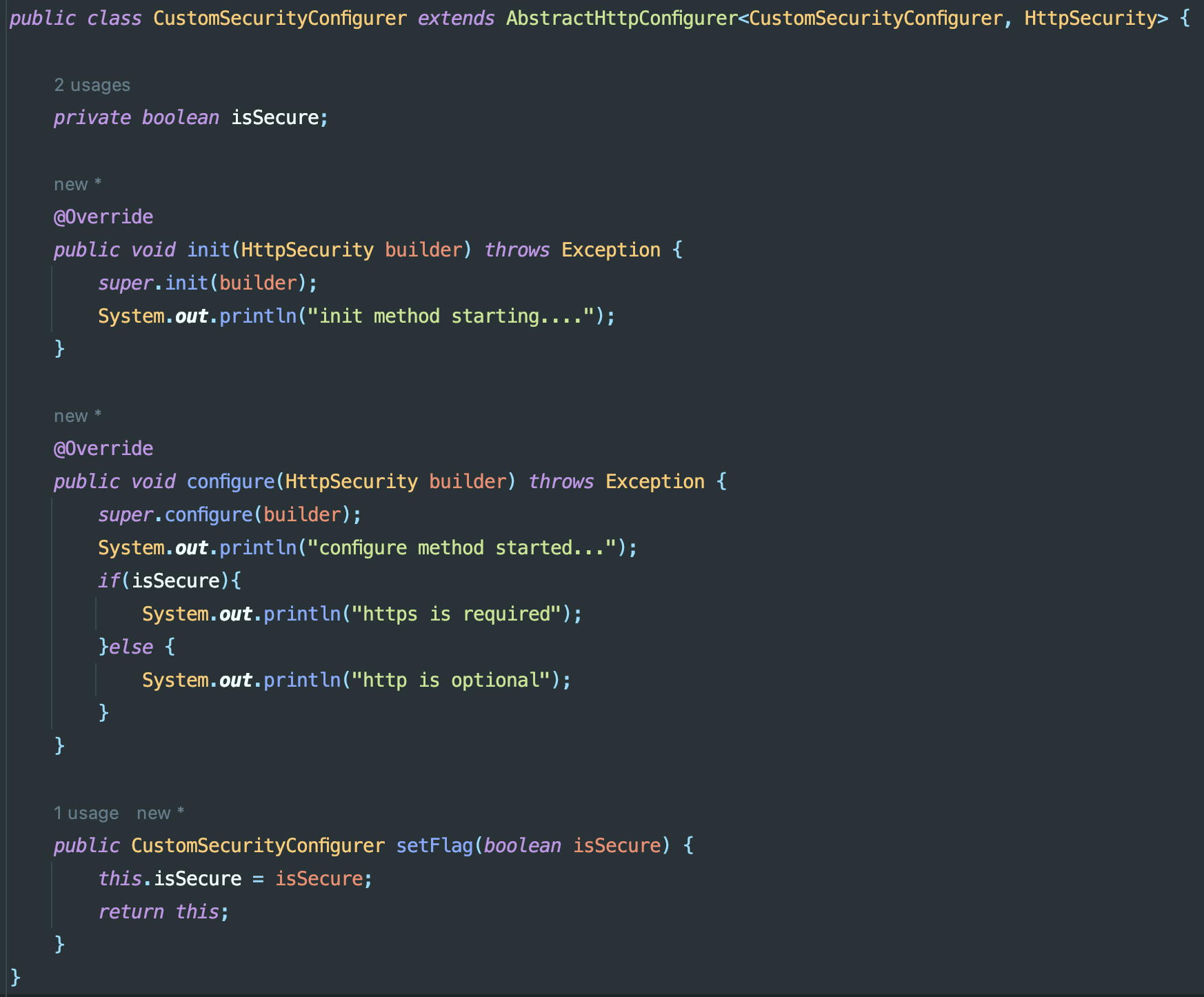 위 apply에 추가한 추가 필터이다. AbstractHttpConfigurer를 상속받아<현재클래스, HttpSecurity>로 타입을 지정한다 초기화 작업 : init() - 초기화시 출력하는부분 확인 가능
