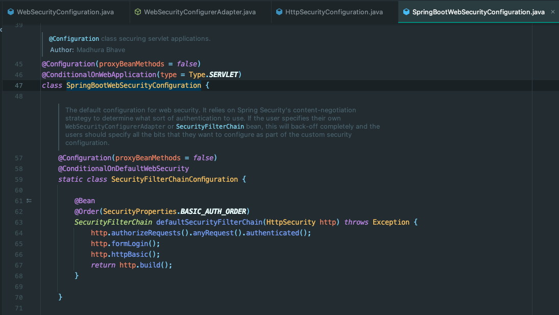 별도의 시큐리티 설정을 하지않아도 http://localhost:8080 접속 시 시큐리티가 동작 하는 이유는 SpringBootWebSecurityConfiguration를 통해서 기본 설정이 되어있기 때문이다