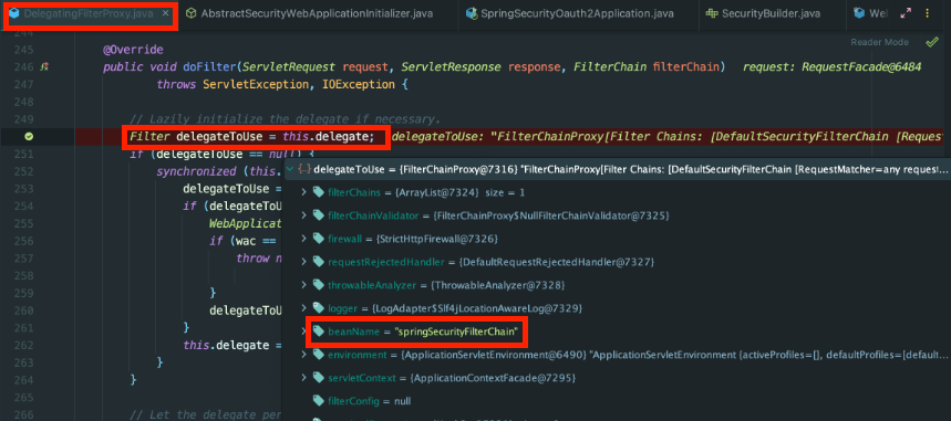 AbstractSecurityWebApplicationInitializer.java를 디버깅시 FilterChainProxy(bean Name: springSecurityFilterChain)이 위임을 받음