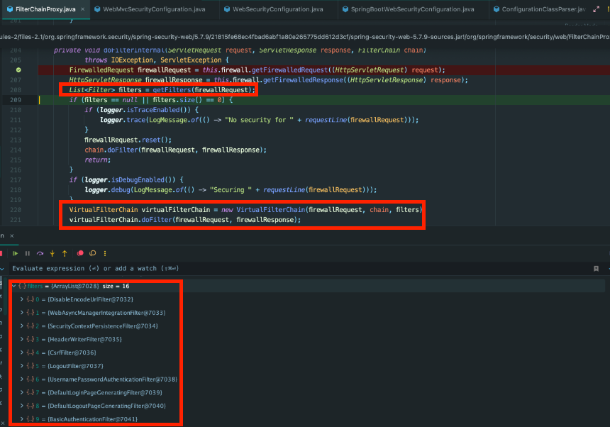 위임받은 FilterChainProxy에서 getFilter로 목록을 가져오고 virtualFilterChain로 차례대로 필터를 실행 2. HttpSecurity.java