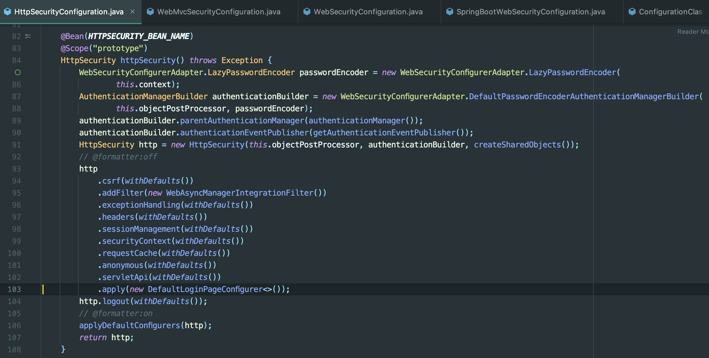 위에 SpringBootWebSecurityConfiguration.java의 defaultSecurityFilterChain메서드의 HttpSecurity클래스는 HttpSecurityConfiguration.java를 통해서 프로토타입으로 빈이 등록되어있다 프로토타입은 싱글턴과 다르게 하나의 객체를 여러곳에서 사용하는 것이 아닌 매번 새로운 객체를 생성하게된다