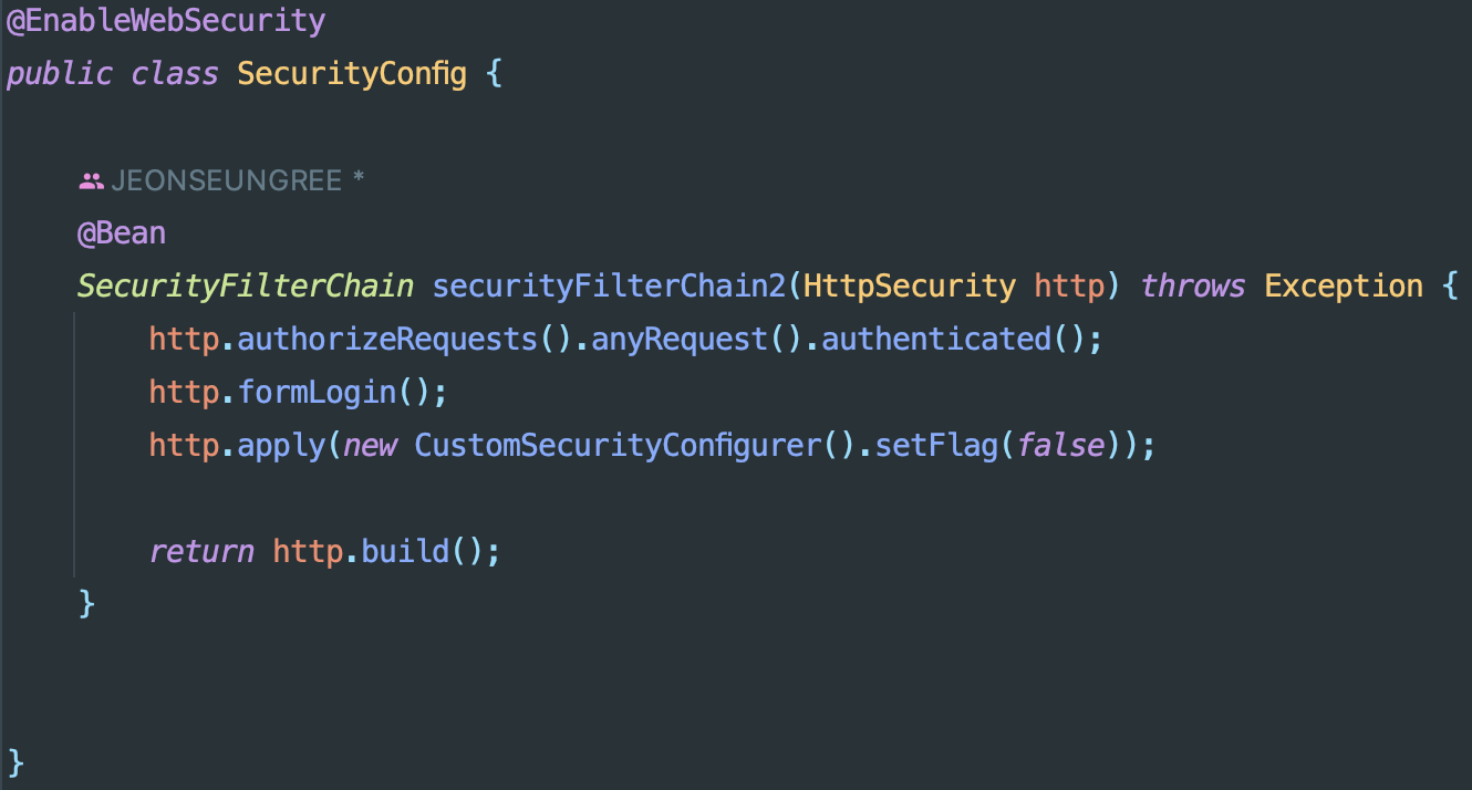 SecurityFilterChain빈으로 등록한 후 Http를 원하는 방법으로 초기화 한다. http.apply()메서드를 통해 추가적으로 초기화 하고자하는 필터를 등록할 수 있다.
