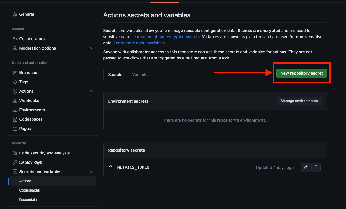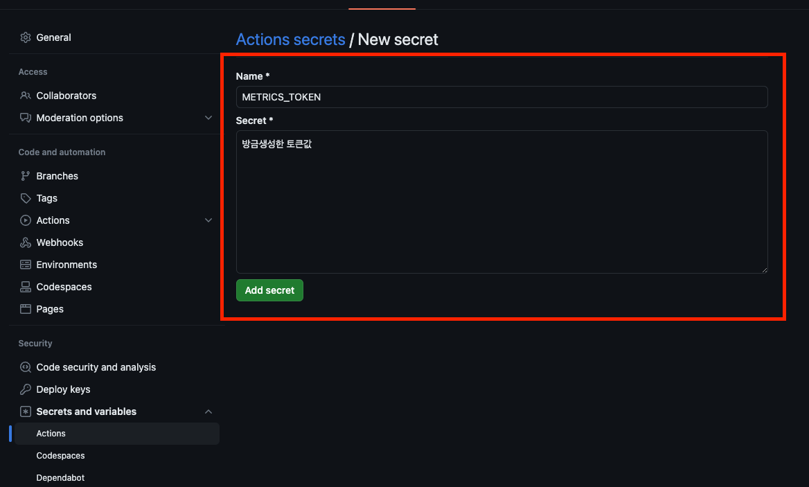 레포지토리 설정 3 토큰 Name은 METRICS_TOKEN 이라고 설정한다.
