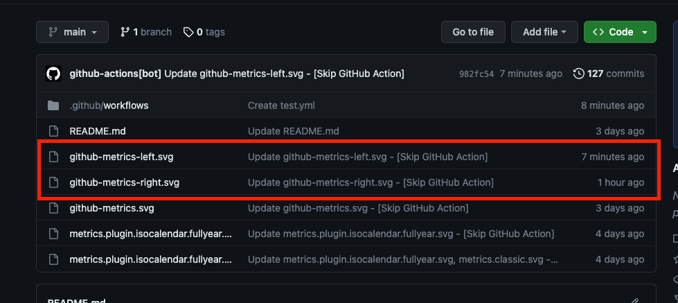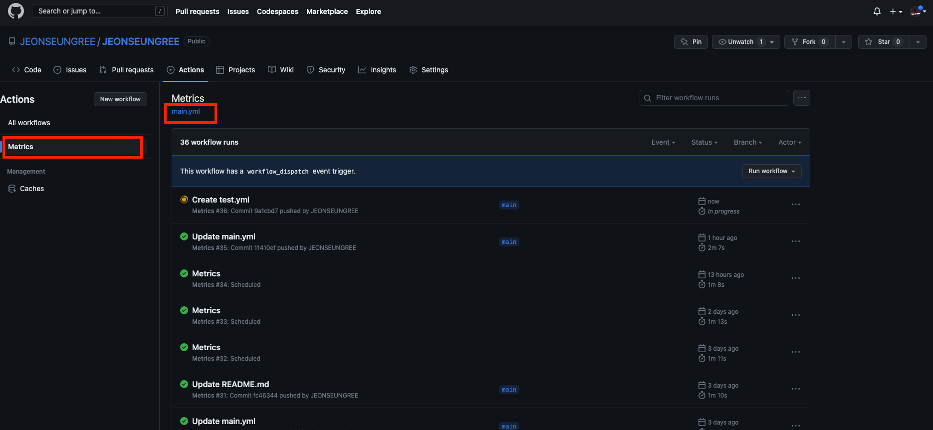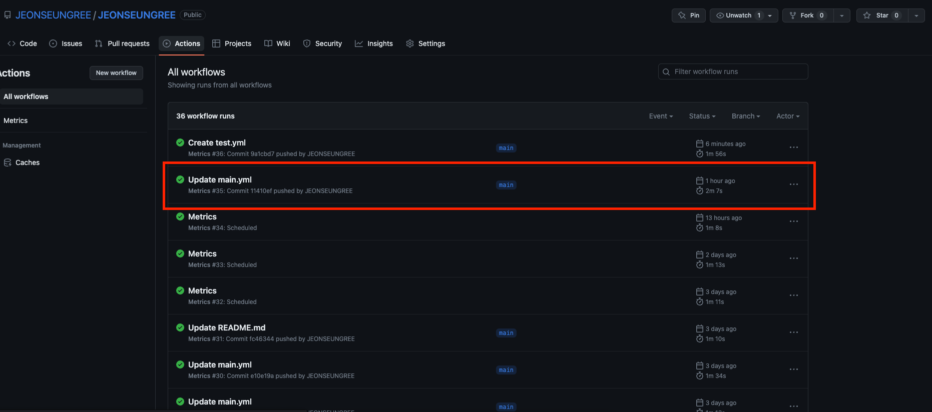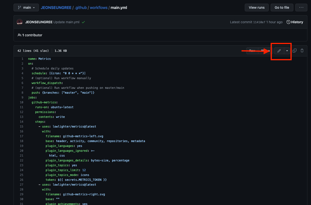 name: Metrics on: # Schedule daily updates schedule: [{cron: "0 0 * * *"}] # (optional) Run workflow manually workflow_dispatch: # (optional) Run workflow when pushing on master/main push: {branches: ["master", "main"]} jobs: github-metrics: runs-on: ubuntu-latest permissions: contents: write steps: - uses: lowlighter/metrics@latest with: filename: github-metrics-left.svg base: header, activity, community, repositories, metadata plugin_languages: yes plugin_languages_ignored: >- html, css plugin_languages_details: bytes-size, percentage plugin_topics: yes plugin_topics_limit: 12 plugin_topics_mode: icons token: ${{ secrets.METRICS_TOKEN }} - uses: lowlighter/metrics@latest with: filename: github-metrics-right.svg base: "" plugin_achievements: yes plugin_achievements_only: >- polyglot, stargazer, deployer, developer, scripter, explorer, infographile plugin_achievements_display: compact plugin_achievements_threshold: X plugin_isocalendar: yes plugin_isocalendar_duration: full-year plugin_repositories: yes plugin_repositories_pinned: 4 token: ${{ secrets.METRICS_TOKEN }}다음과 같이 yaml 파일 작성한다.