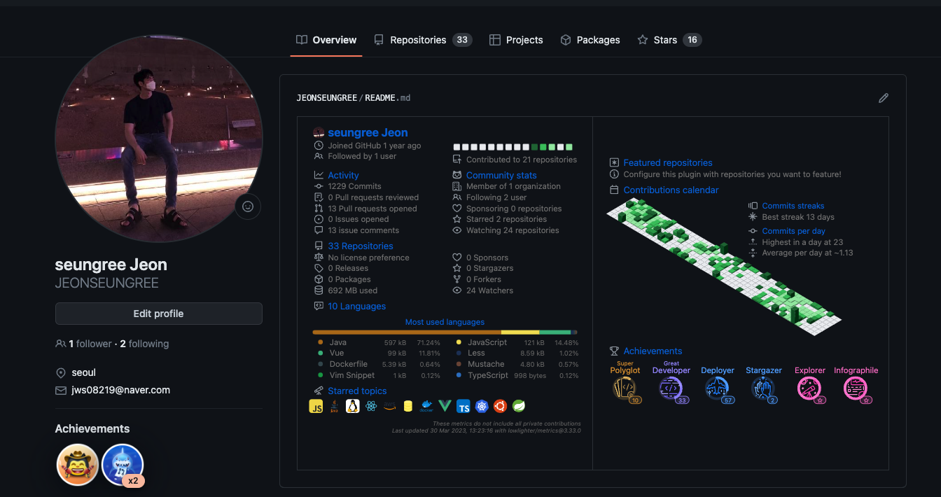<table> <tbody> <tr> <td align="center"> <img src="github-metrics-left.svg" alt="" /> </td> <td align="center"> <img src="github-metrics-right.svg" alt=""/> </td> </tr> </tbody> </table>이후 프로필 초기화면으로 돌아가면 방금 반영한 README.md 파일을 확인할 수 있다.