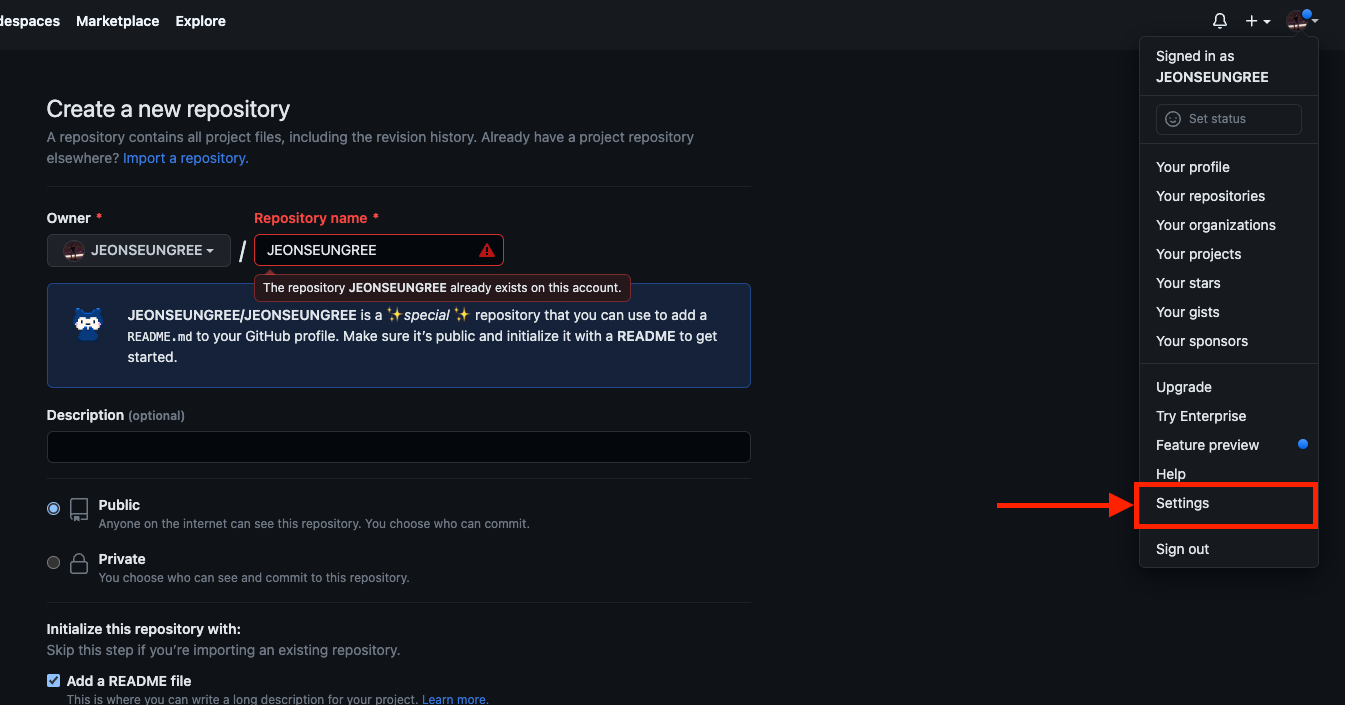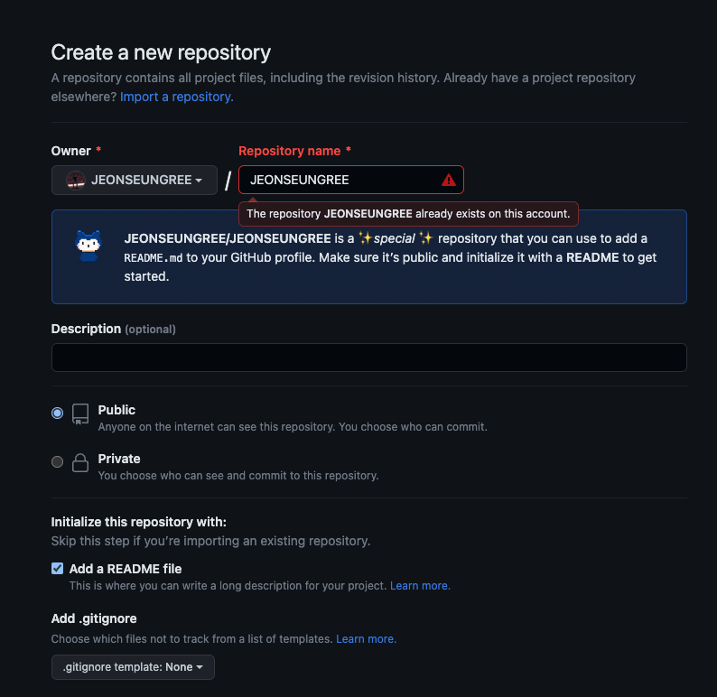 다음과같이 Add a REAME file에 체크한 뒤 생성한다 (이미 존재하는경우 아래와같이 알림이 뜬다)
