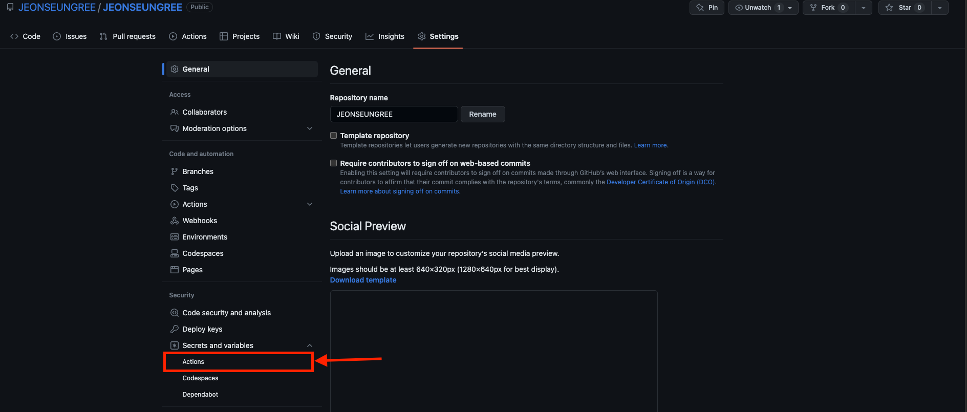 레포지토리 설정 1 다시 레포지토리로 돌아온후 Settings > Secrets and variables > Actions 클릭