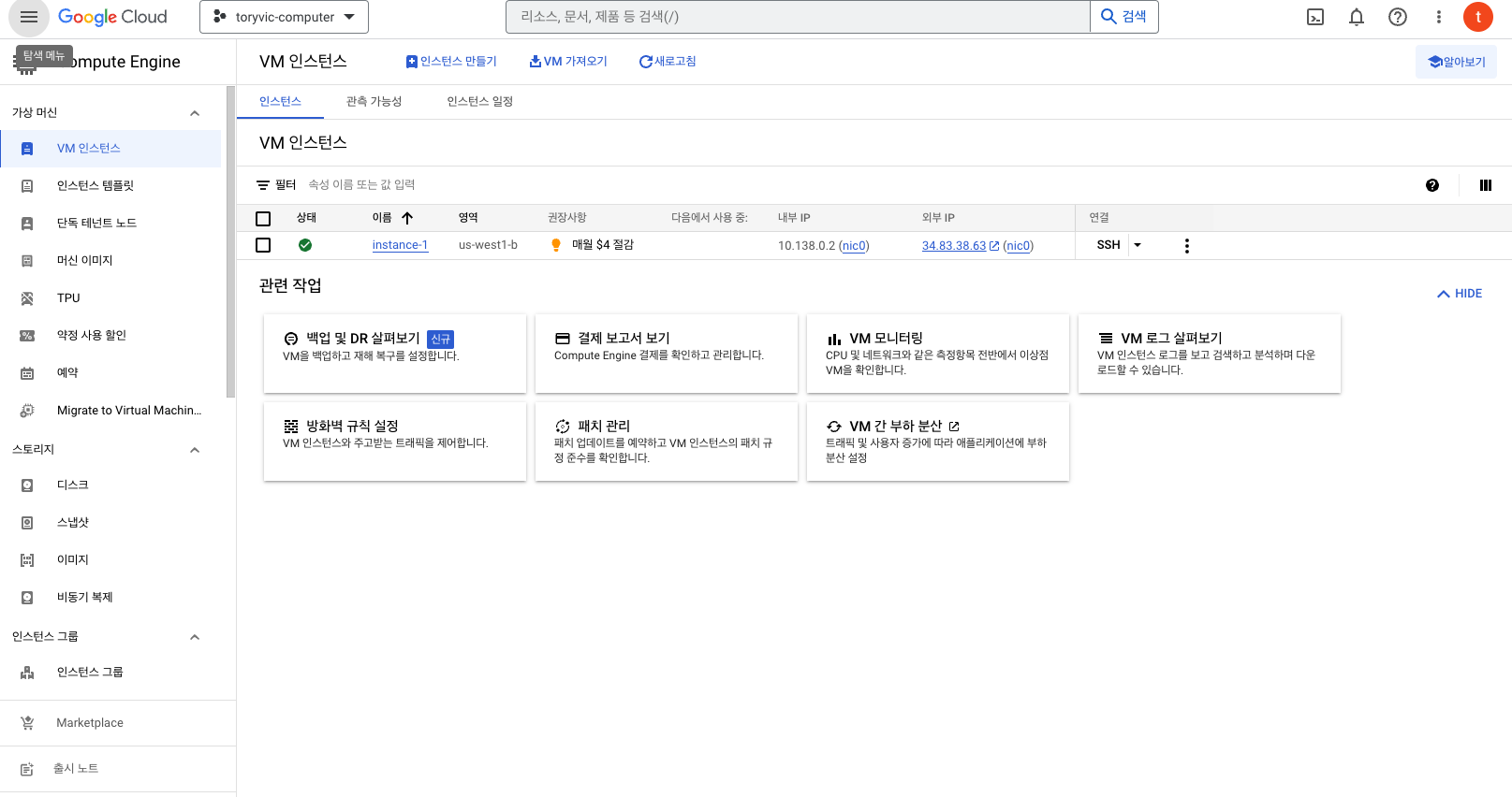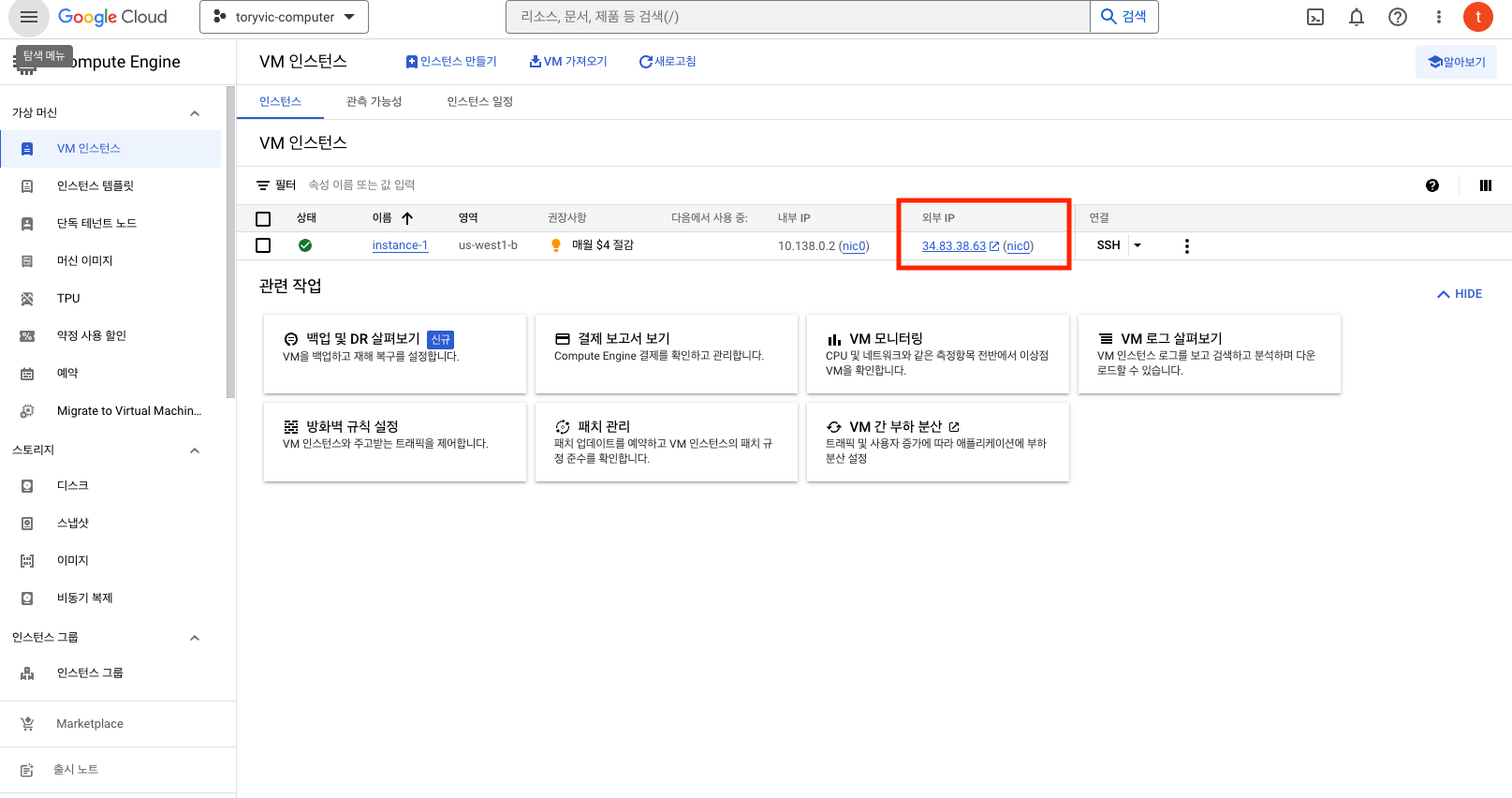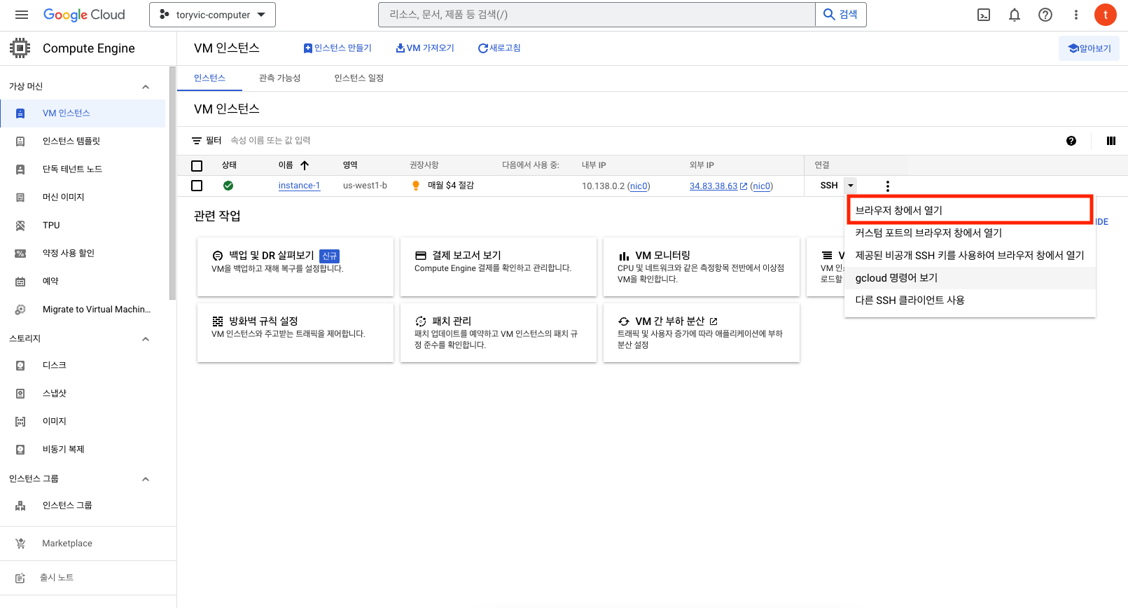 1. GCP 인스턴스 접속 ( 위에 생성된 컴퓨터 )