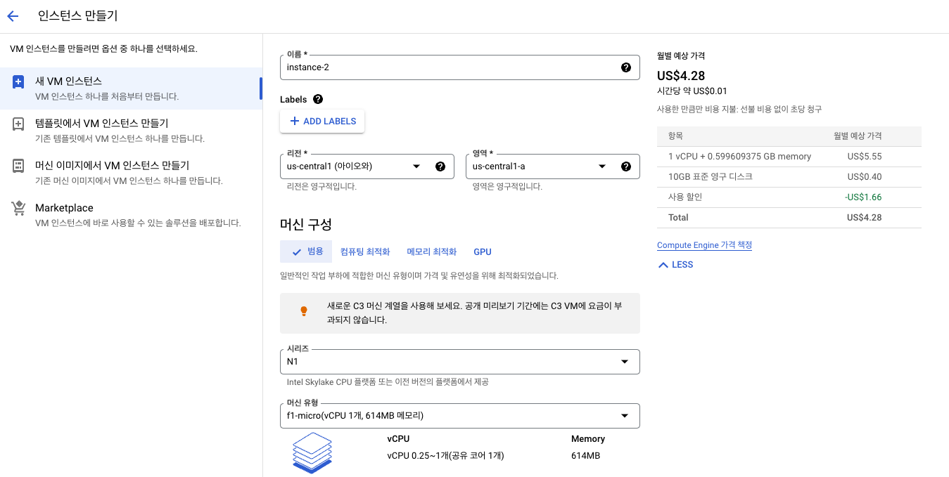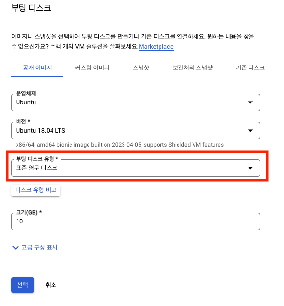 클라우드 생성 2 표준 영구 디스크 선택