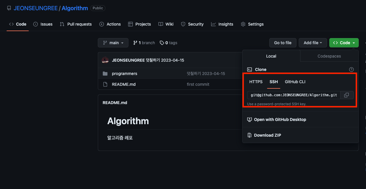 깃허브 SSH 3 위에 초록색 코드 버튼 클릭후 SSH 탭을 눌러 복사