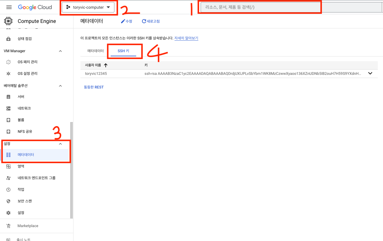 cat ~/.ssh/[KEY_FILENAME].pub #위에 생성된 생성한 .pub키를 복사하여 GCP로 이동1. ComputeEngine 검색 또는 탭 클릭