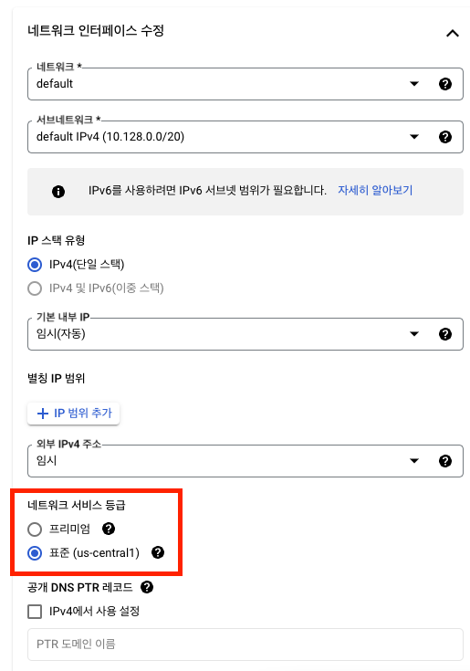 결제 보고서 2 네트워크 프리미엄 설정 -> 표준 등급으로 설정 (아래에 인스턴스 생성시 초기에 생성시 설정) - 생성된 인스턴스에서 변경법은 찾지못했다.