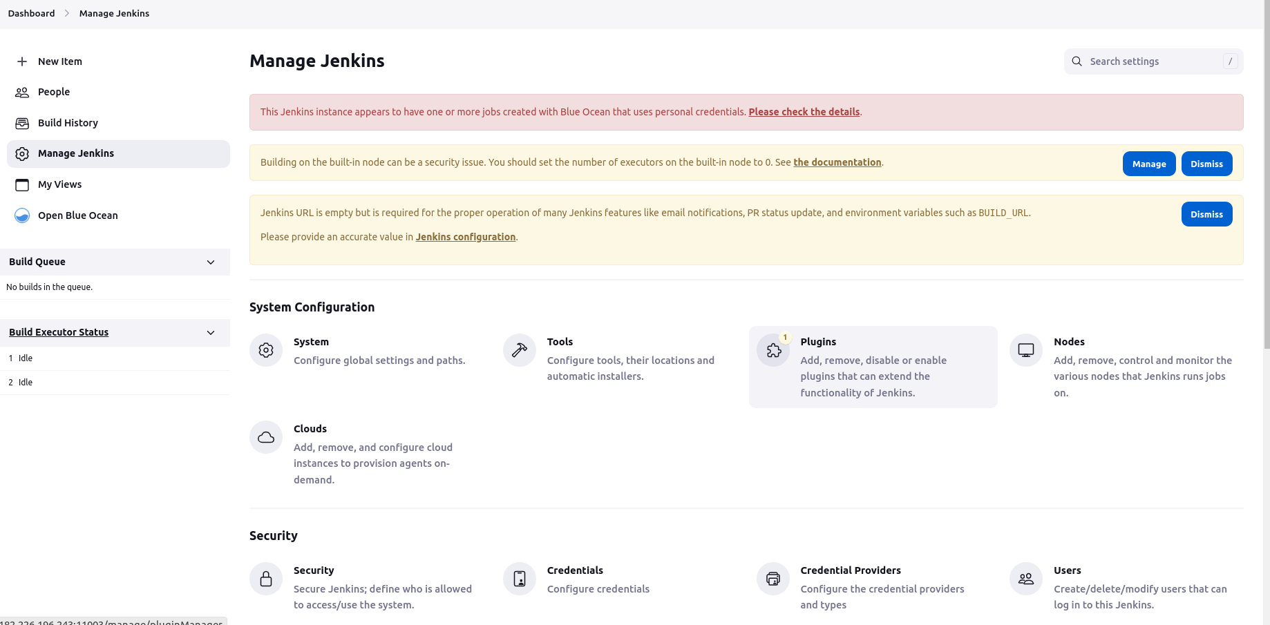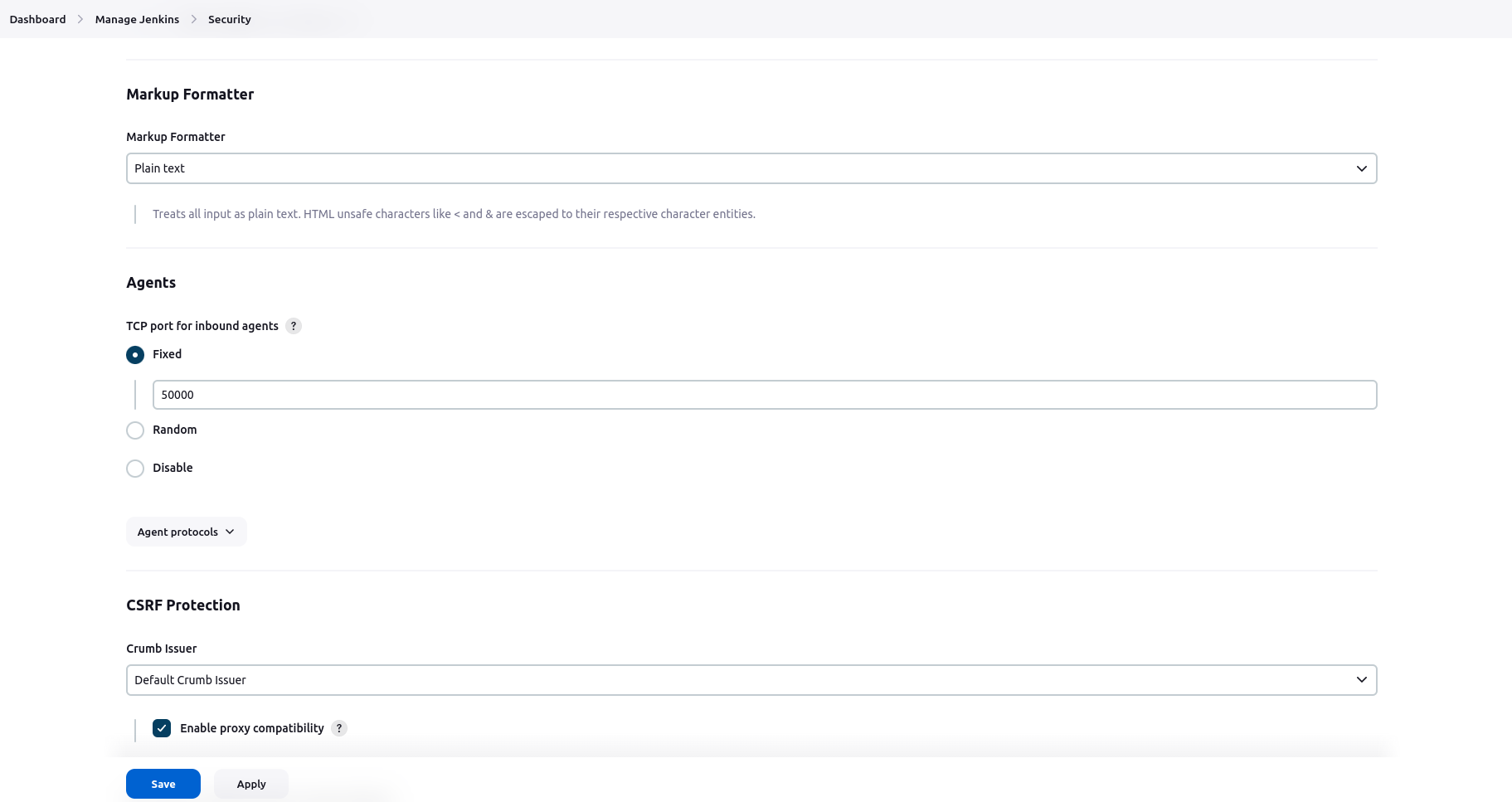 url, port 지정 DashBoard -> Manage Jenkins -> Security -> Agents 포트를 Fixed 50000으로 설정한다.