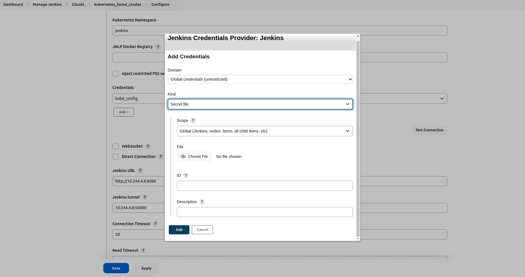 Add 버튼 클릭 -> kind Secret file 선택 -> ~/.kube/config 파일을 복사하여 file에 올린다음 Add)