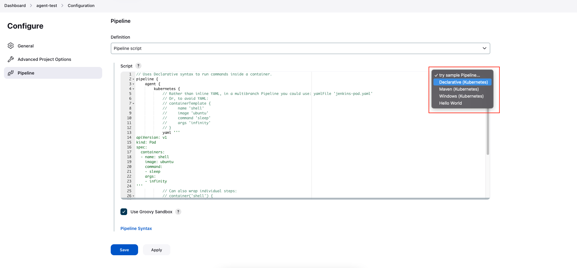 pipleline 프로젝트 pipeline 하단에 선언형으로 파드를 생성하고 동작하도록 누르고 자동으로 생성된 샘플코드를 그대로 저장한다.