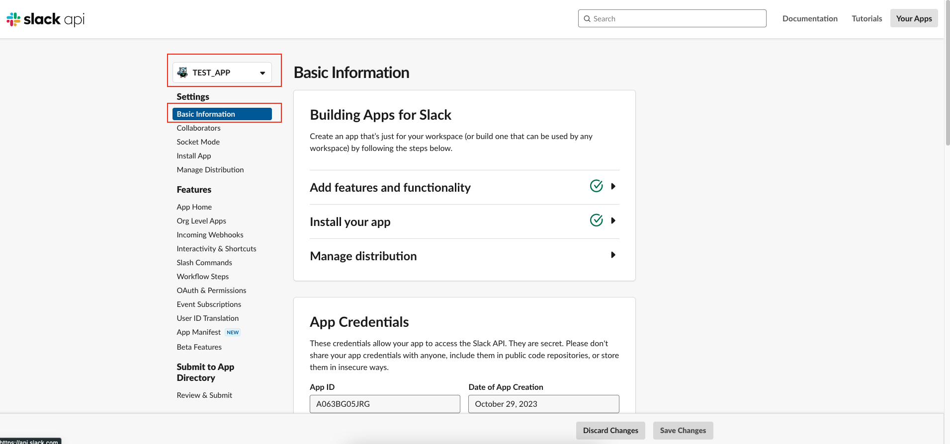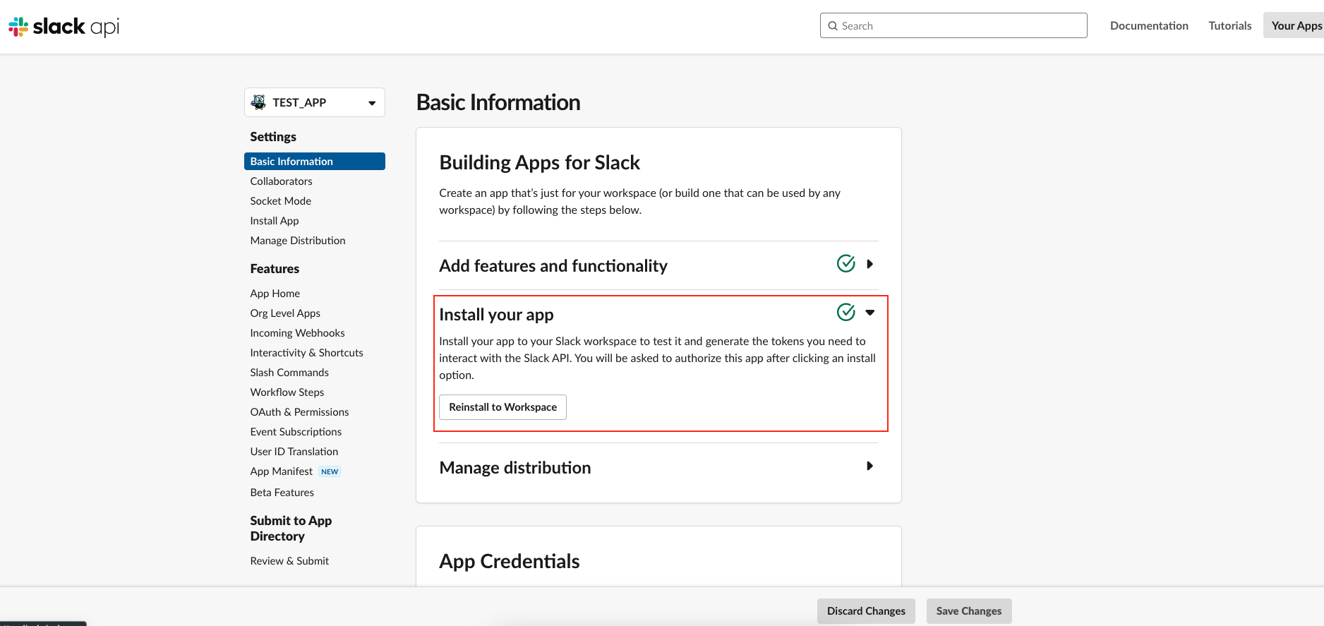 좌측 네비게이션 Basic Information -> Install your app에서 워크스페이스에 install 한다