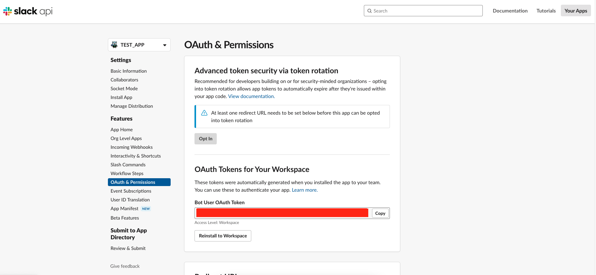앱 워크스테이션에 설치 좌측 네비게이션 OAuth & Permissions -> Bot User OAuth Token 토큰을 따로 메모장에 복사하여둔다.
