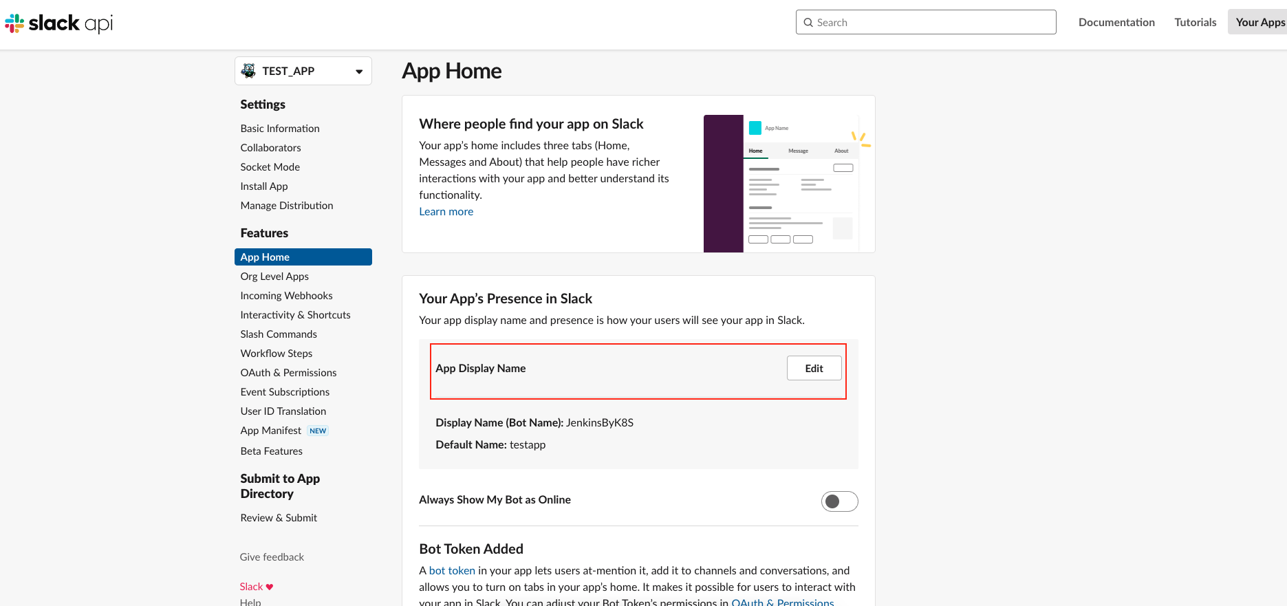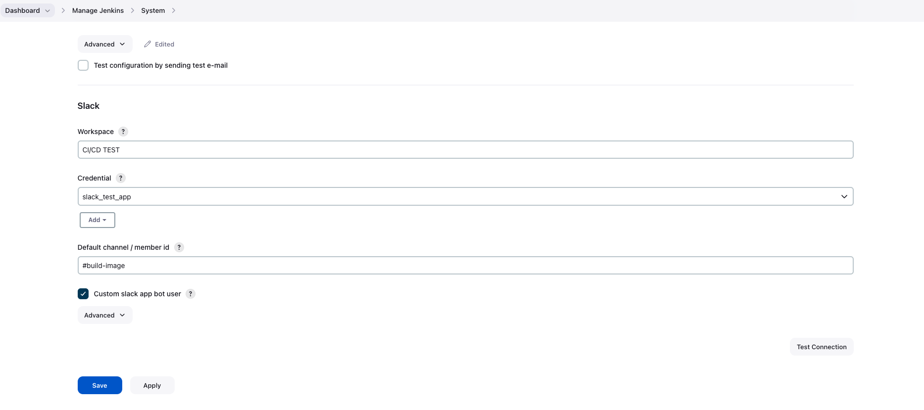 4. Custom slack app bot user 체크 후 Test Connection으로 연결 여부 체크