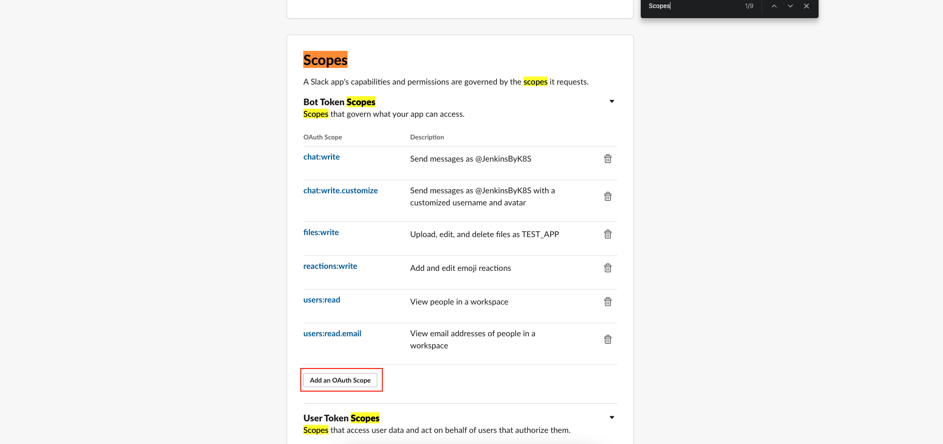 Permission 클릭 하단에 Scopes에서 Add an OAuth Scope를 클릭 -> chat:write, chat:write.customize, reactions:write 등을 등록한다.