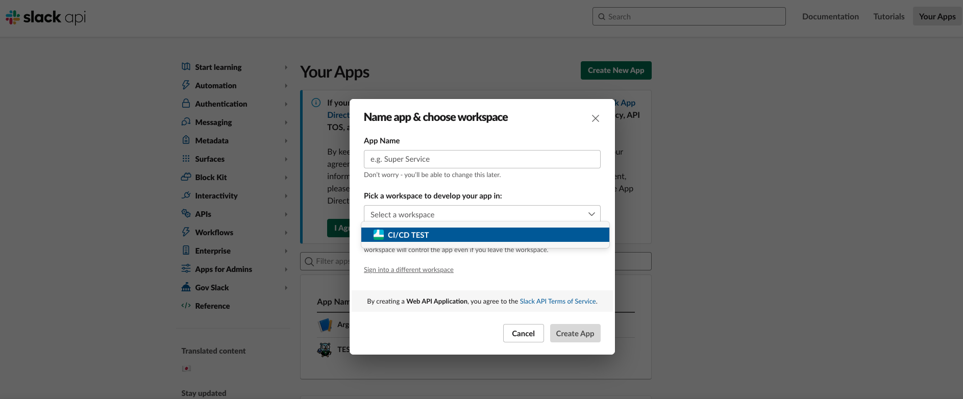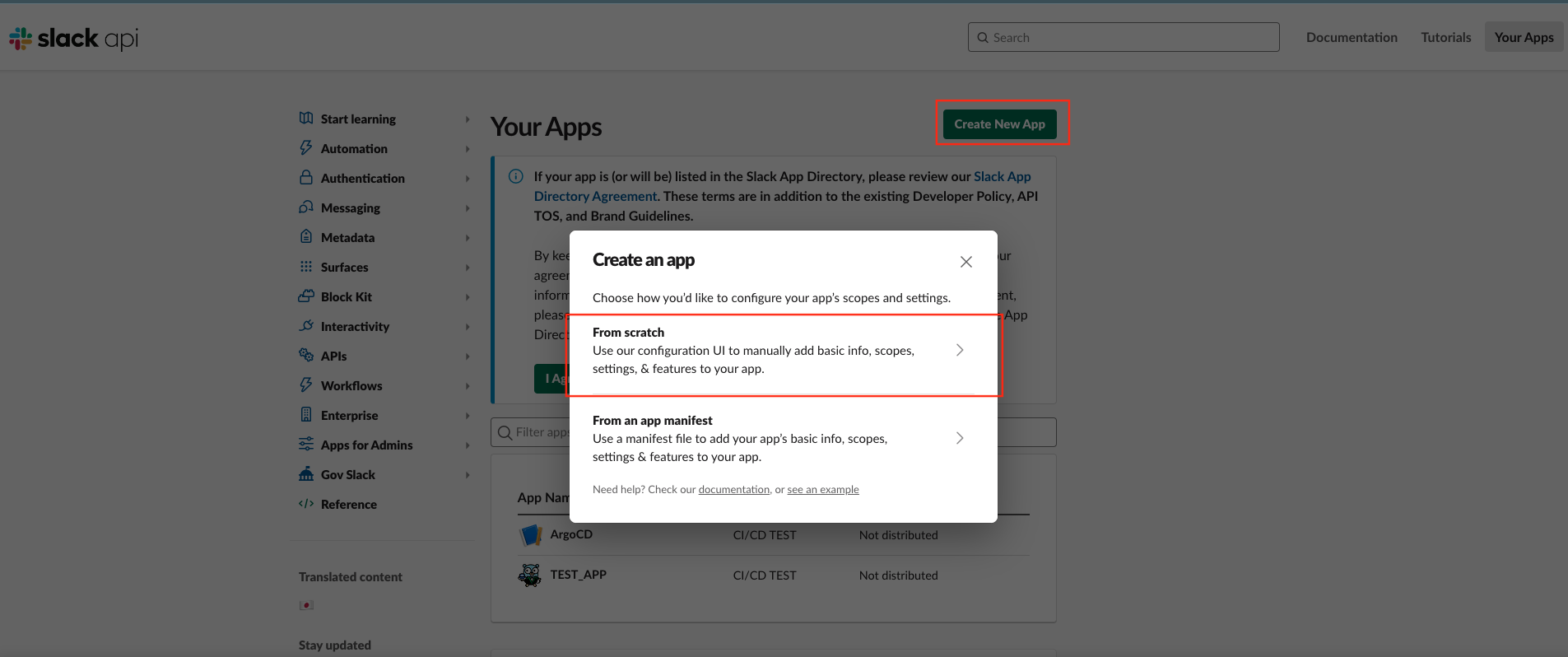https://api.slack.com/apps 이동 -> Create New App From -> From Scratch 실행