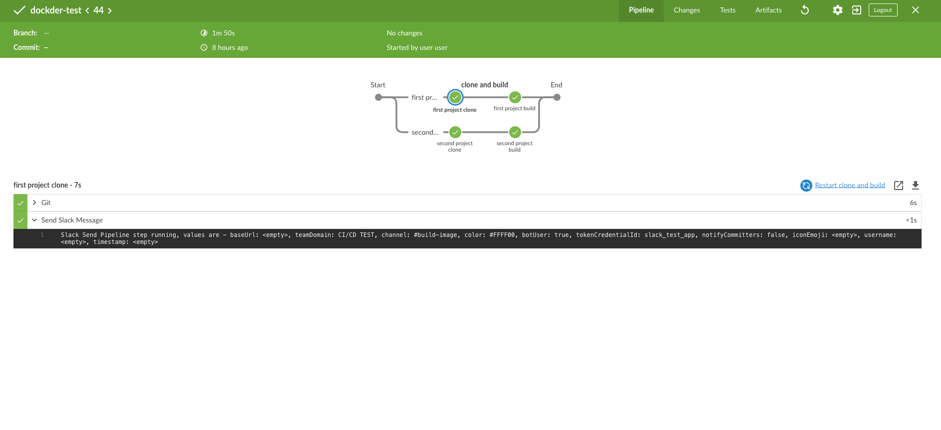// Uses Declarative syntax to run commands inside a container. pipeline { agent { kubernetes { inheritFrom 'toryjdk17' } } stages { stage('clone and build') { parallel { stage('first project') { stages { stage('first project clone') { steps{ container('jenkins-jdk-17') { git branch: 'dev', url: 'https://github.com/JEONSEUNGREE/ecommerce-backend' slackSend(channel: "#build-image", color: "#FFFF00", message: "Hi Test") } } } stage('first project build') { steps { container('jenkins-jdk-17') { dir('.') { sh ''' echo 'start bootJar' ./gradlew clean bootJar ''' } } } } } } stage('second project') { stages { stage('second project clone') { steps{ container('jenkins-jdk-17-2') { git branch: 'dev', url: 'https://github.com/JEONSEUNGREE/ecommerce-frontend' } } } stage('second project build') { steps { container('jenkins-jdk-17-2') { dir('.') { sh ''' echo 'start bootJar' ''' } } } } } } } } } }빌드 성공 후 로그에서 슬랙메시지 전송 확인