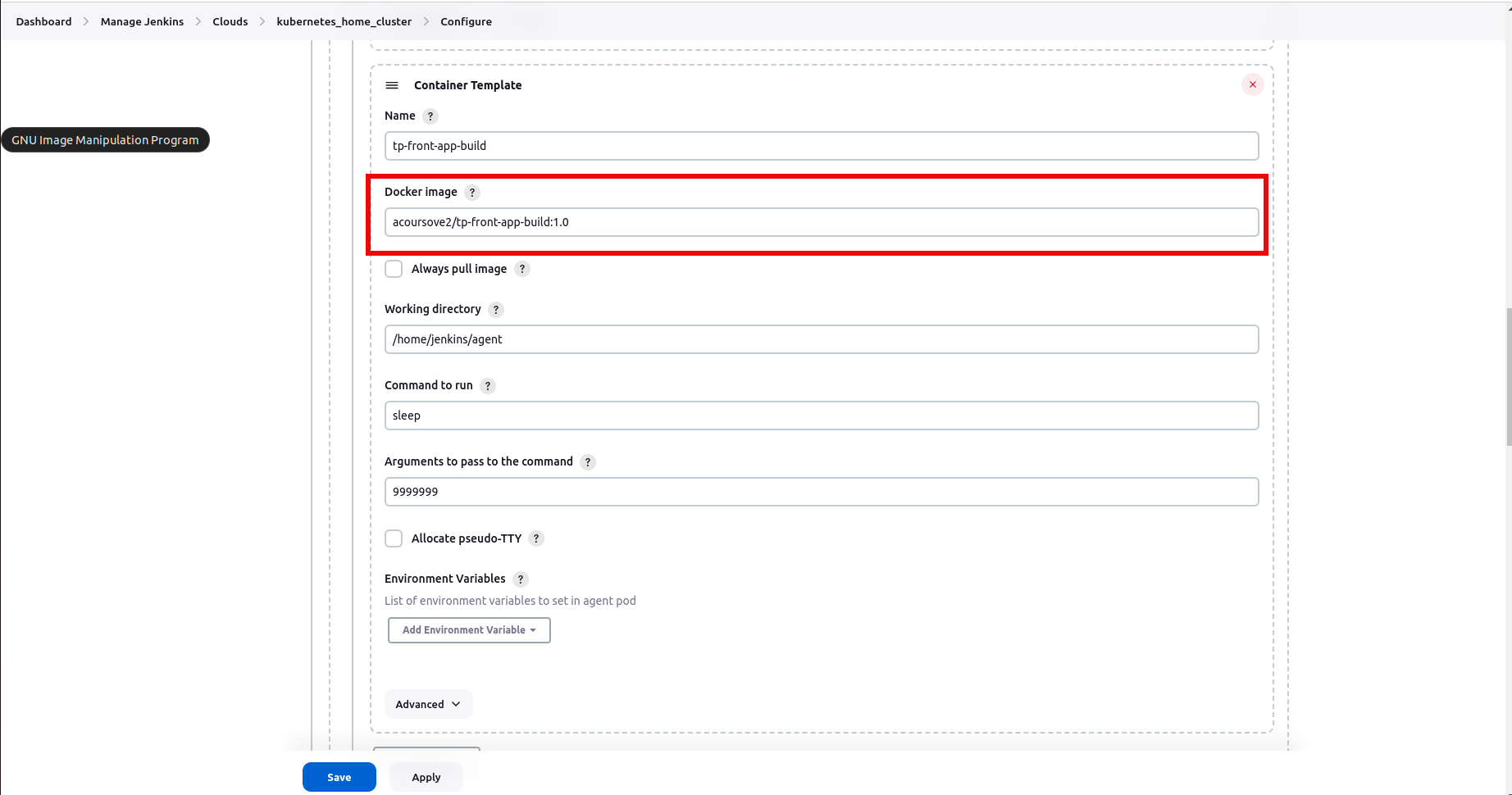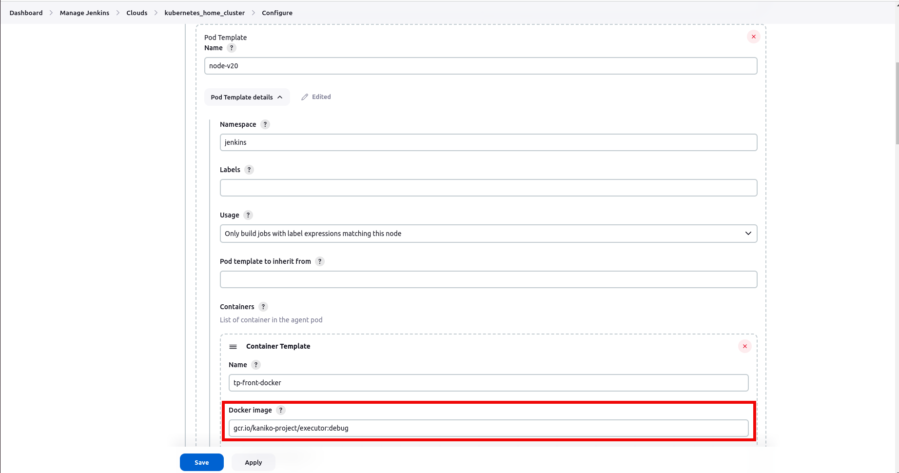 젠킨스 -> Dashboard -> Manage Jenkins -> Cloud -> K8S 클러스터 선택 -> Configure