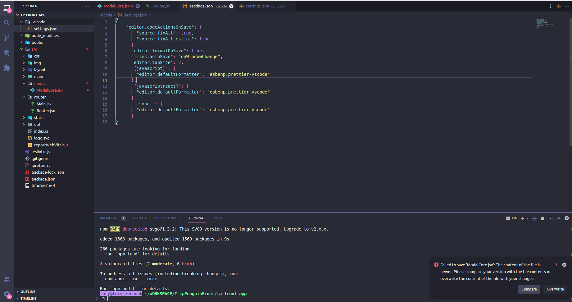 eslintrc 파일 확인 후 setting.json 수정 { "editor.codeActionsOnSave": { "source.fixAll": true, "source.fixAll.eslint": true }, "editor.formatOnSave": true, "files.autoSave": "onWindowChange", "[javascript]": { "editor.defaultFormatter": "esbenp.prettier-vscode" }, "[javascriptreact]": { "editor.defaultFormatter": "esbenp.prettier-vscode" }, "[jsonc]": { "editor.defaultFormatter": "esbenp.prettier-vscode" } }setting.json에 아래와 같이 설정을 진행한다.