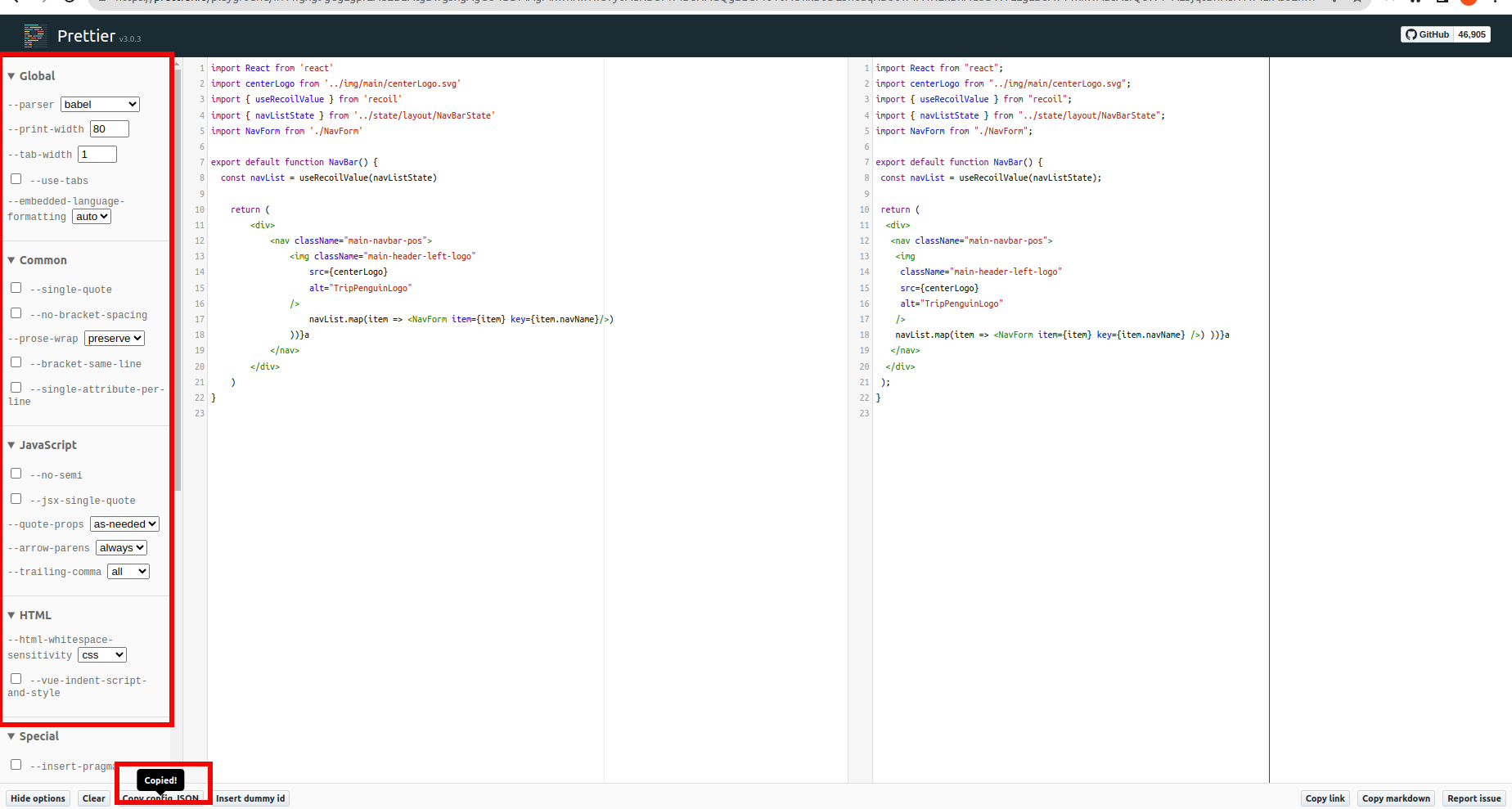 Prettier 왼쪽에서 옵션 확인 후 적용하여 미리보기가 가능하다.