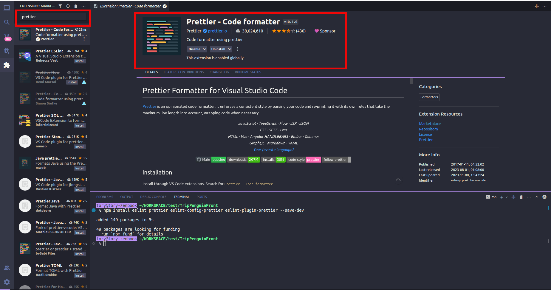 저장시 우측하단에 Prettier탭을 클릭하여 포맷 적용을 확인할 수 있다.