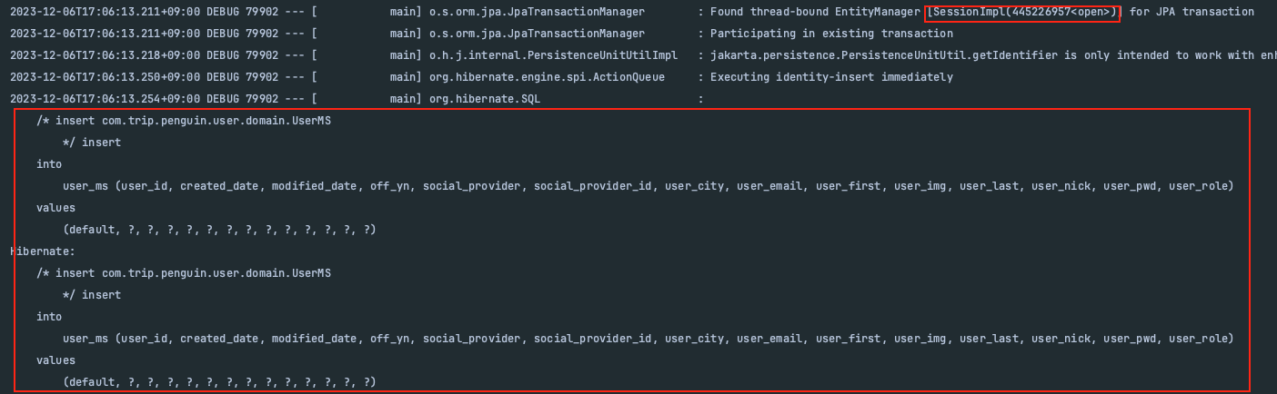 logging: level: root: debug org: hibernate.orm.jdbc.bind: trace # 바인딩 파라미터 확인transcation의 open 확인과 로그 확인시 정상적으로 flush()와 clear()는 확인했다.
