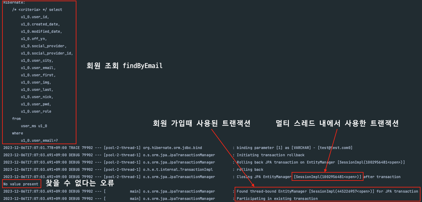 메인 스레드에서 회원가입을 진행했기 때문에 해당 스레드에서는 조회가 되었다.